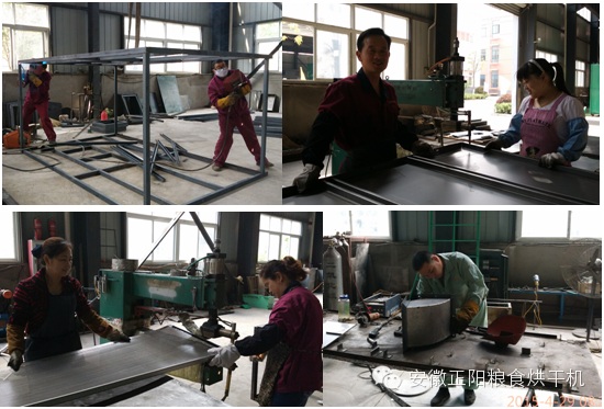 工人們正在車間內(nèi)加緊生產(chǎn)糧食烘干機,現(xiàn)場機器轟鳴,焊花飛濺。